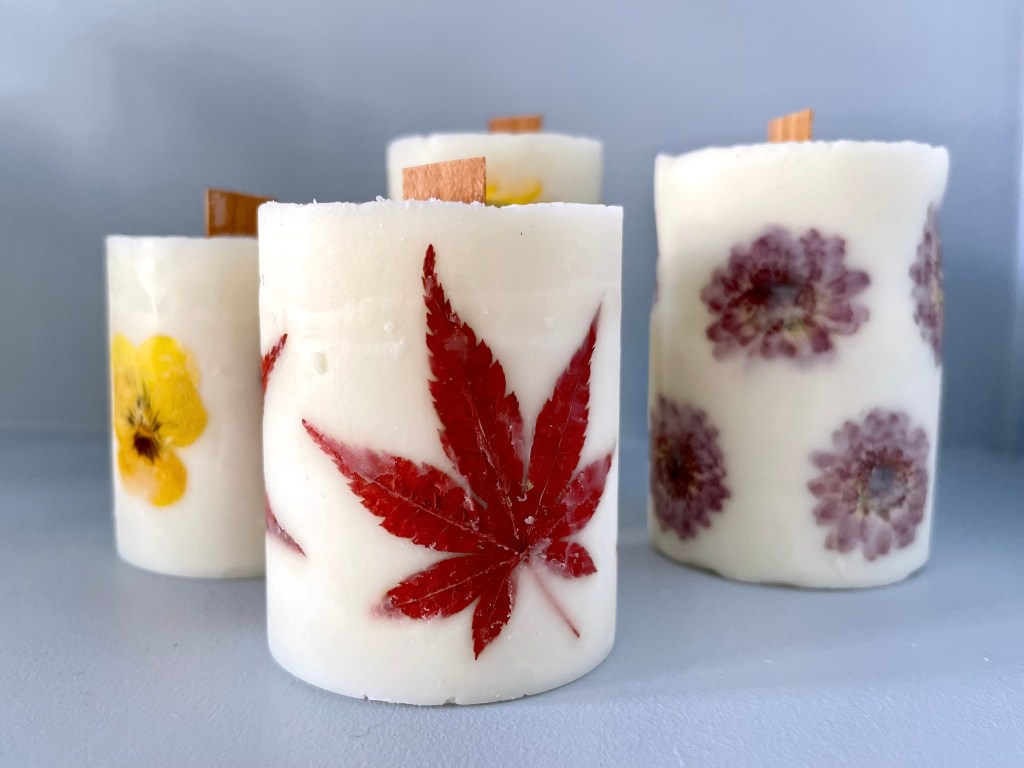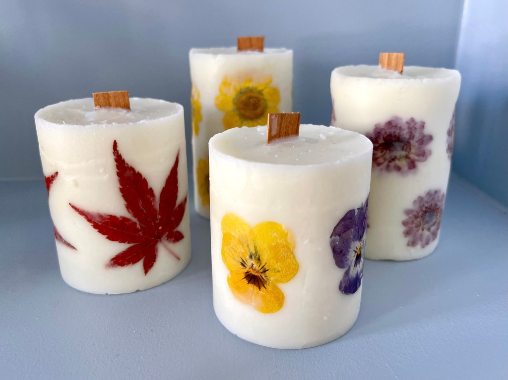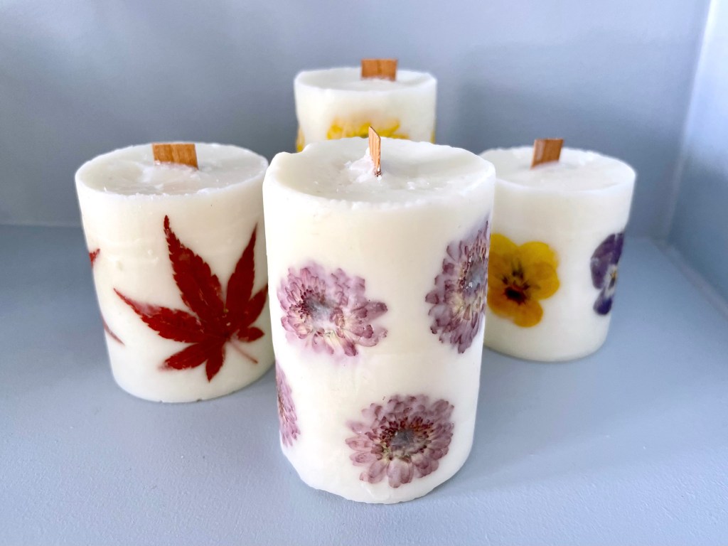 I love the look of real pressed flowers embedded into the candle. Of course, these are handmade from natural soy wax, are lightly scented with vanilla, and come with a wood wick for that perfect cozy crackling sound when burning. The pansies candle is my favorite, since the pressed pansies come straight from my little balcony garden!