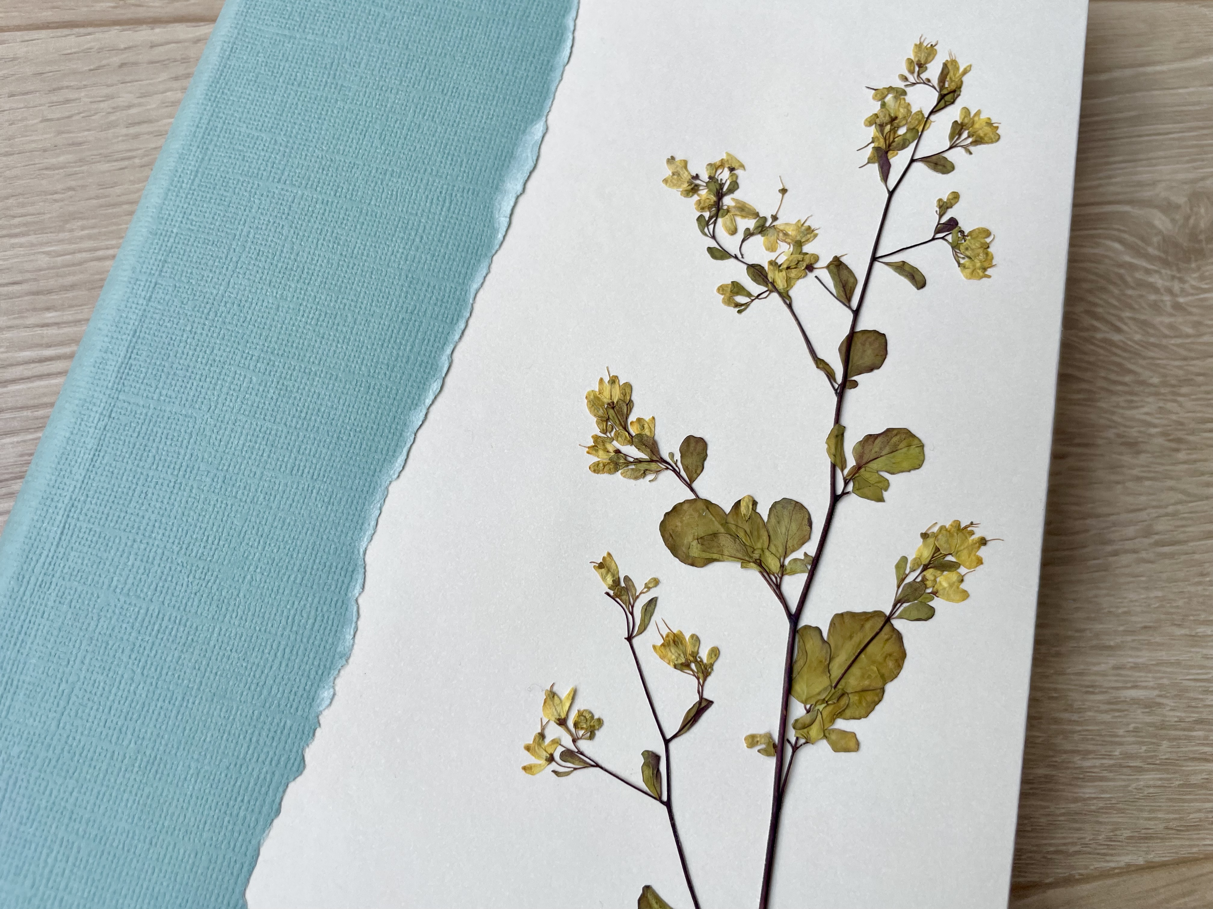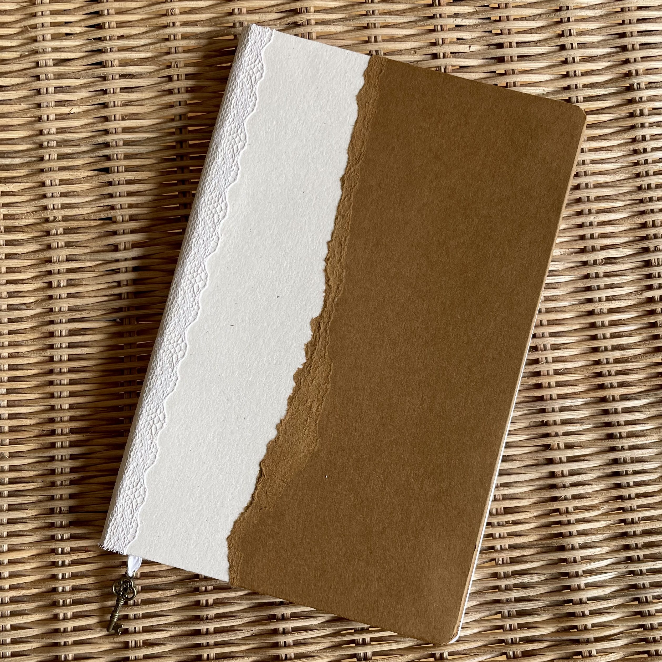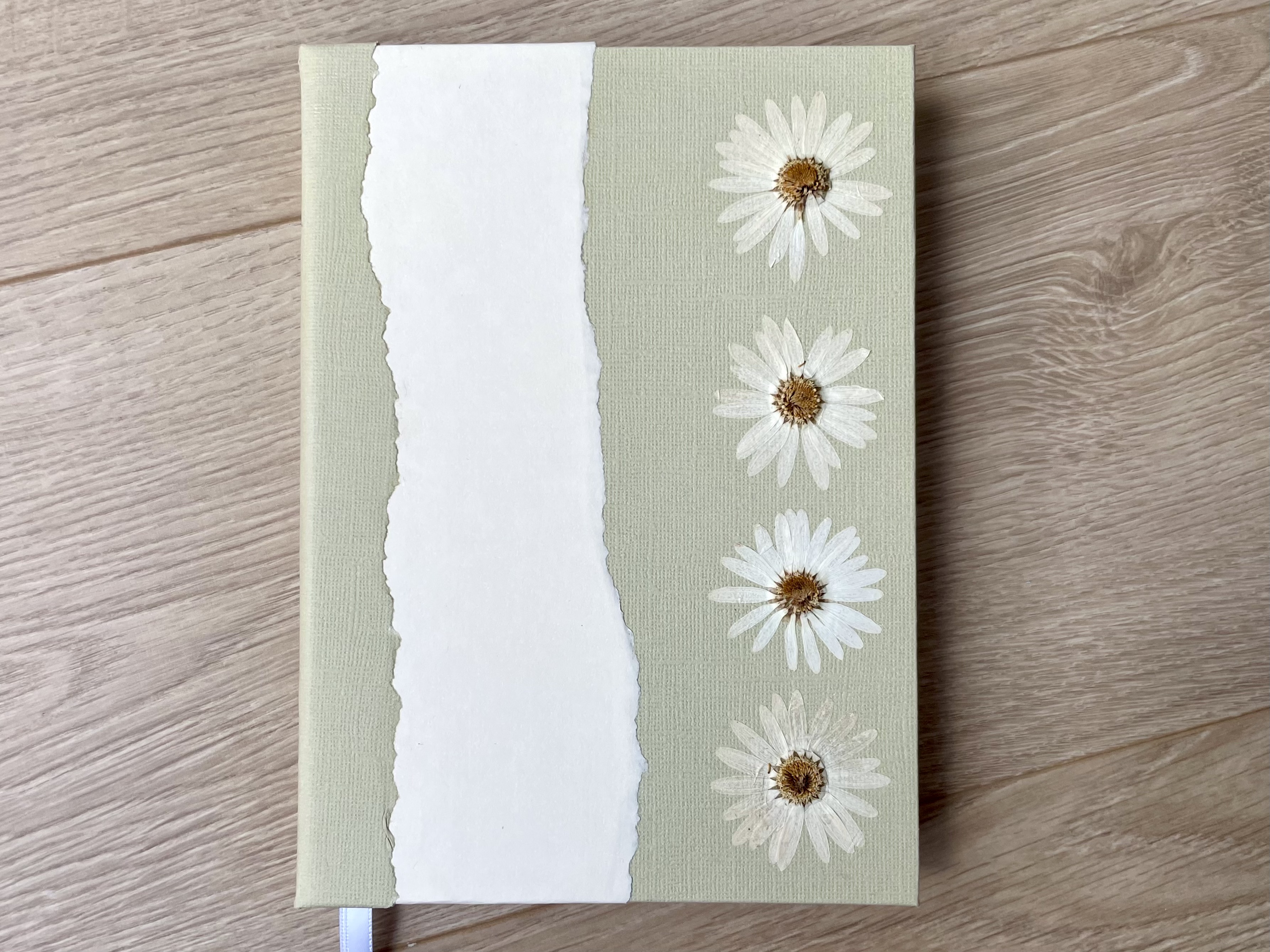 My journal covers are handcrafted with textured paper, showcasing my unique “ripped” design. I love decorating the covers with real pressed flowers for a touch of natural beauty or delicate lace on the spine for a little extra elegance. Each journal is hand-bound with care to lay flat when you work, and untrimmed to allow the natural deckled edges to show!