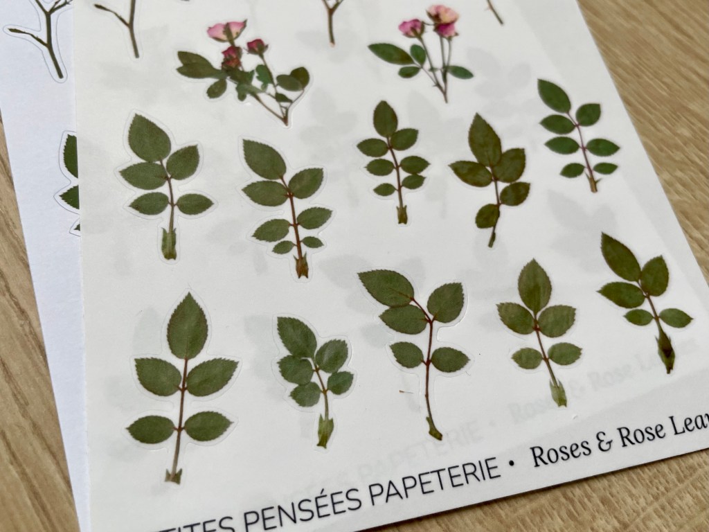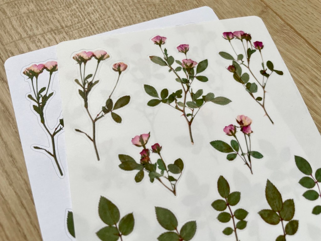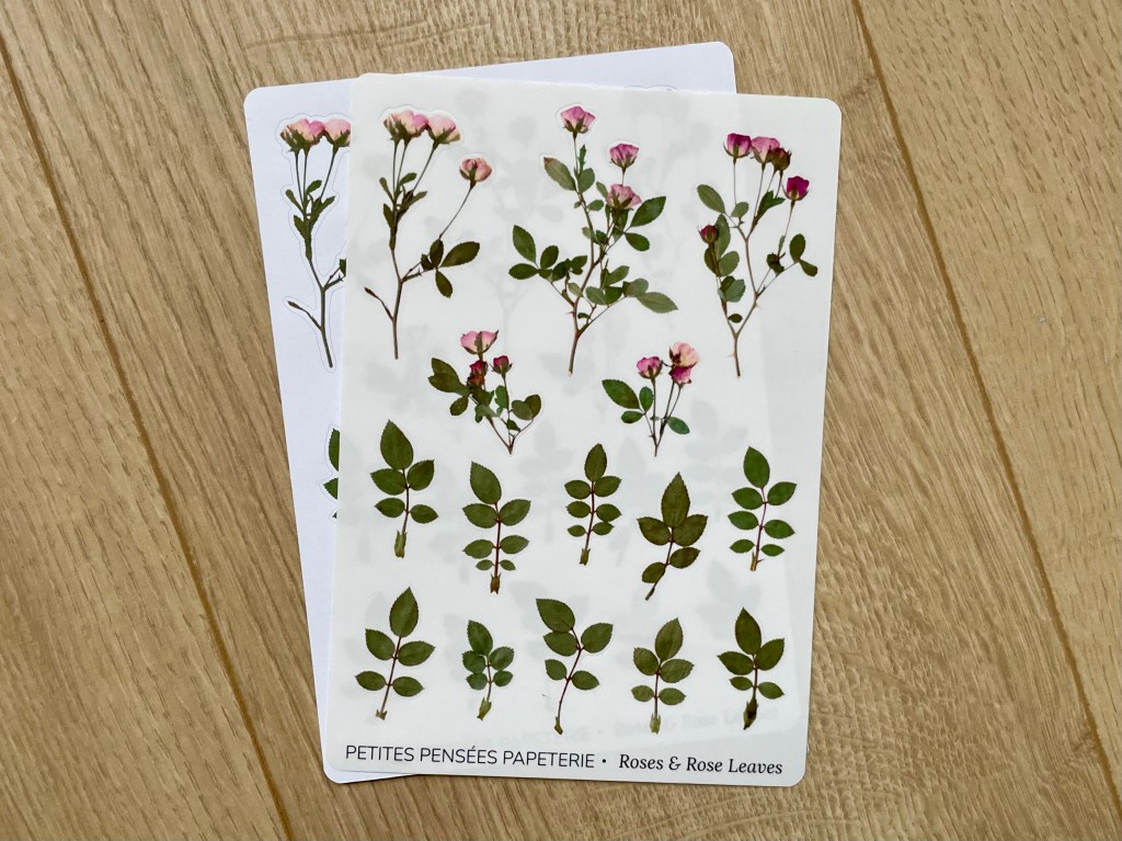 Alternatively, I created some realistic stickers of pressed rose buds and leaves that look super realistic in your journal. The advantage is you can use them in any journal to get the same romantic vibes without having real 3D flowers in your journal. I also have quite the collection of realistic pressed flower stickers in my Etsy shop.