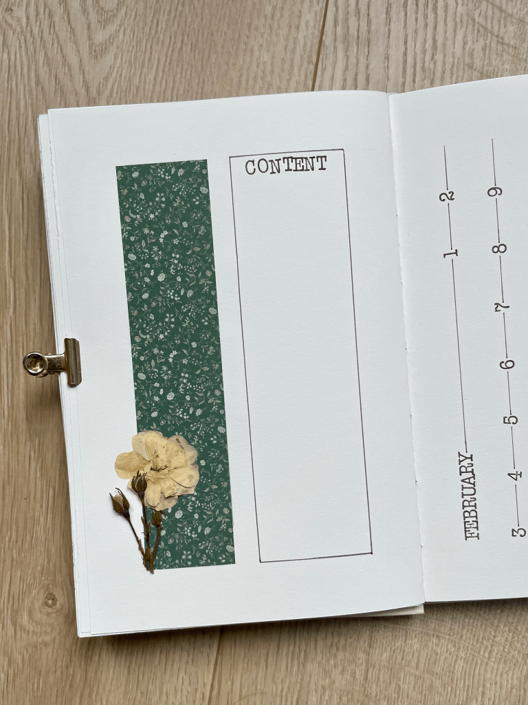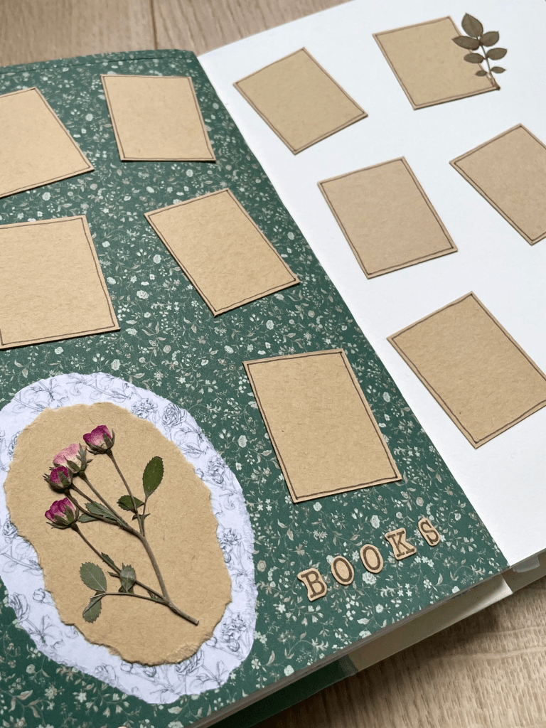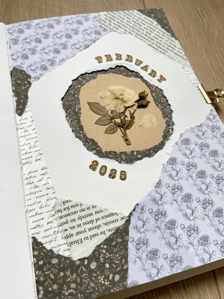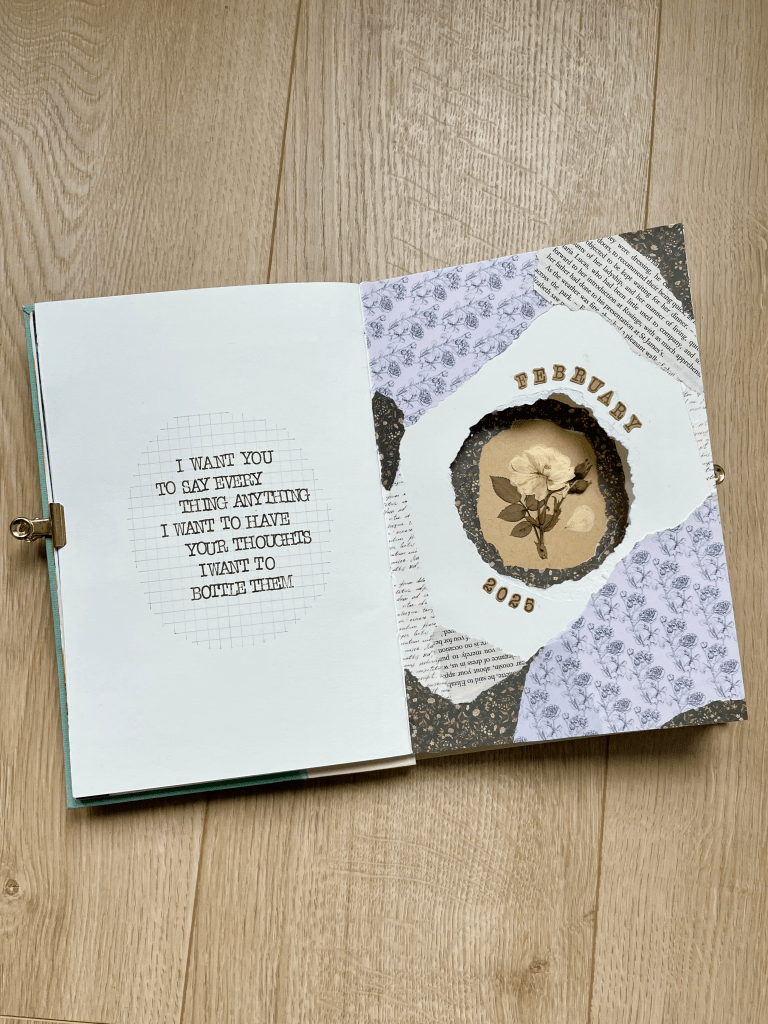 I’ve been wanting to try framing my cover page with a cutout window, and this felt like the perfect opportunity. On the right, I used different ripped pattern paper to create frames around the central pressed rose. On the left, I added a romantic quote from “Alone with you in the ether” by Olivie Blake, which is visible through the frame when you turn the page. My initial idea was to use the inside of the second page as a brain dump, but I liked the final look too much as is, so I left it simple and clean.