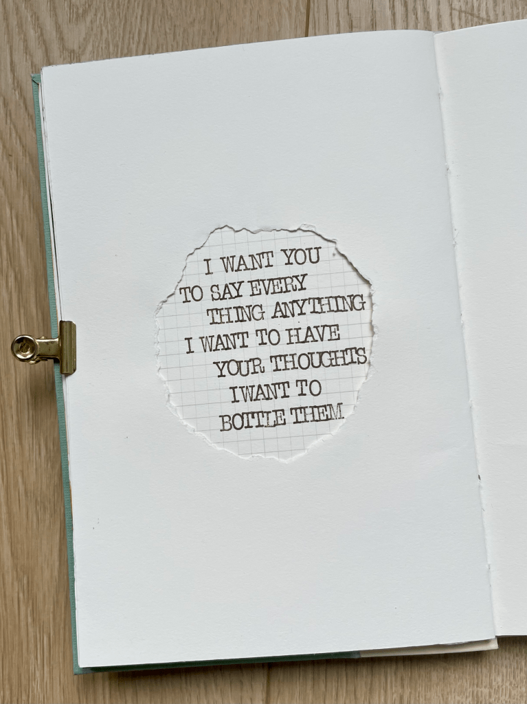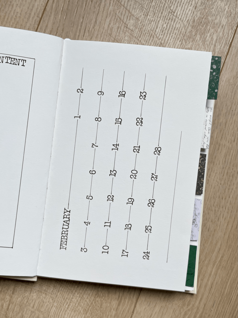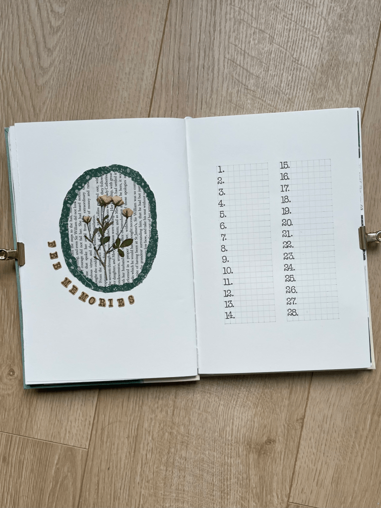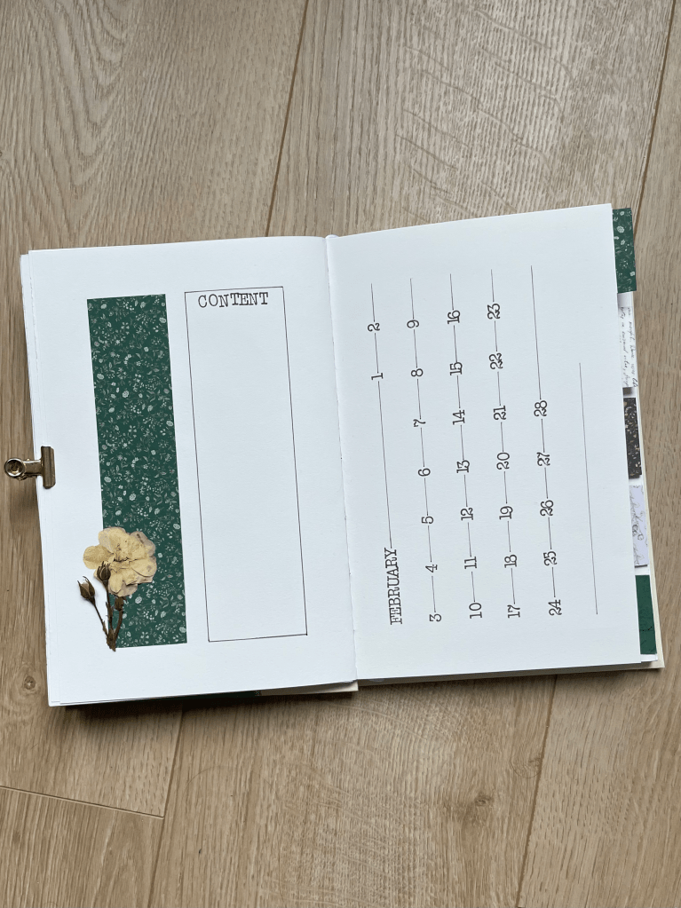 I’ve been wanting to try framing my cover page with a cutout window, and this felt like the perfect opportunity. On the right, I used different ripped pattern paper to create frames around the central pressed rose. On the left, I added a romantic quote from “Alone with you in the ether” by Olivie Blake, which is visible through the frame when you turn the page. My initial idea was to use the inside of the second page as a brain dump, but I liked the final look too much as is, so I left it simple and clean.