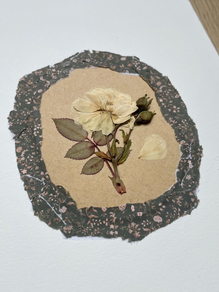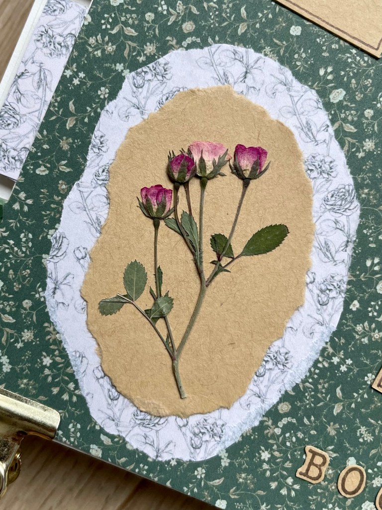 This is actually my least favorite spread this month (I think it turned out much too busy), even thought I love the pressed rose buds in this collage frame and the little rose leaf detail. If I were to do it again, I would simply avoid the busy background pattern.