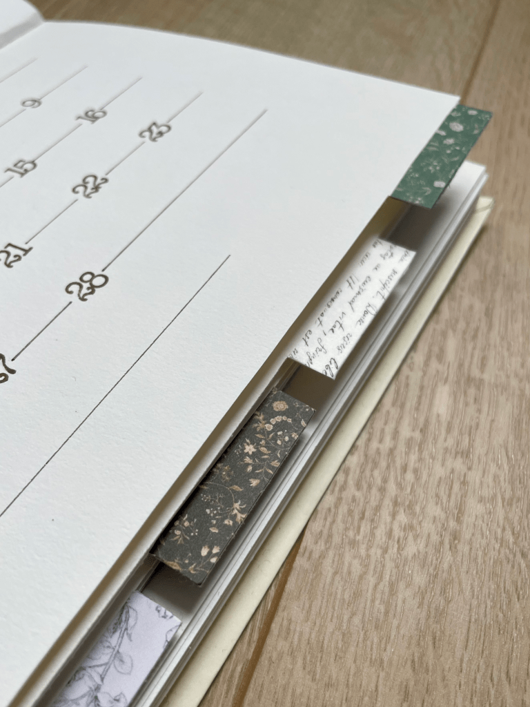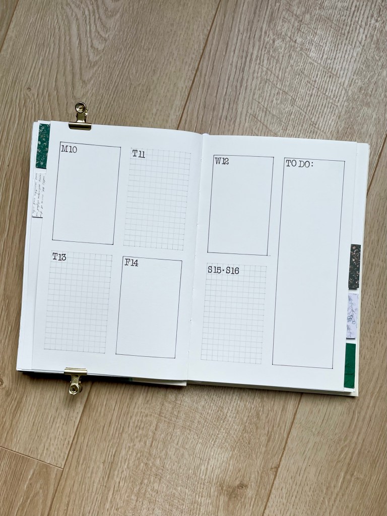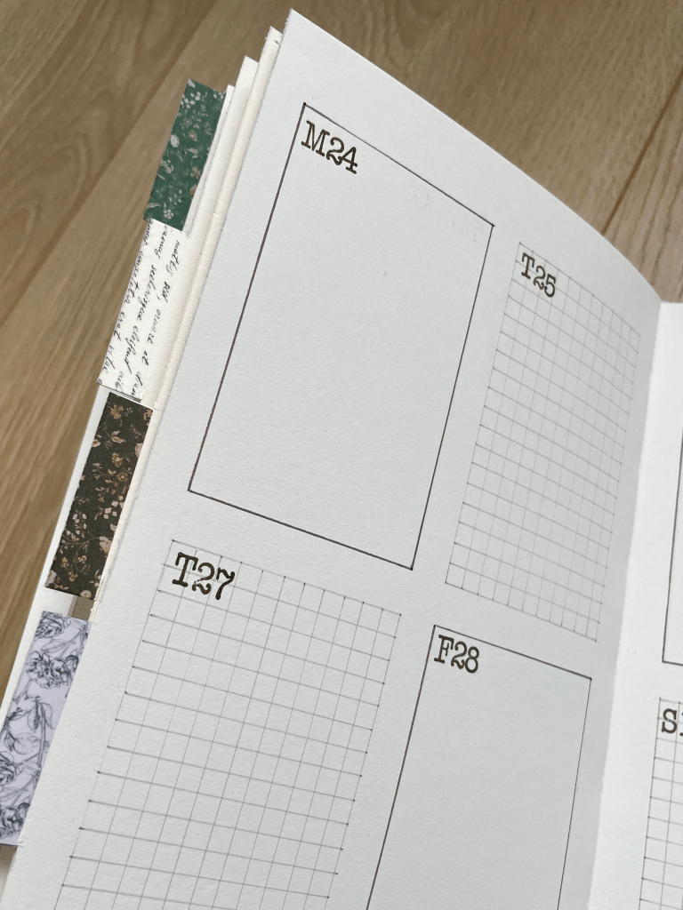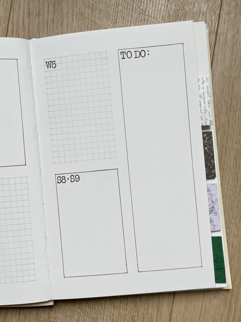 Because I use these spreads every single day to de-clutter my brain, I realized I prefer them to be super minimal. I created minimalist weeklies by alternating between plain brown boxes and light grey grid boxes for each day, with a simple stamped header. The only decor element brings everything together: I created simple tabs for each week using the same floral patterned paper as my other spreads.