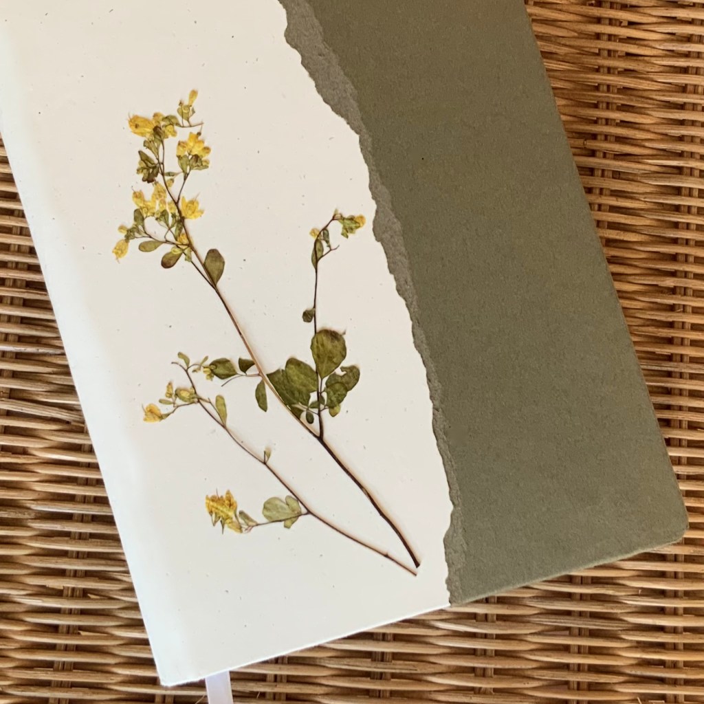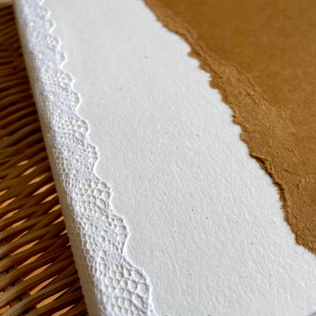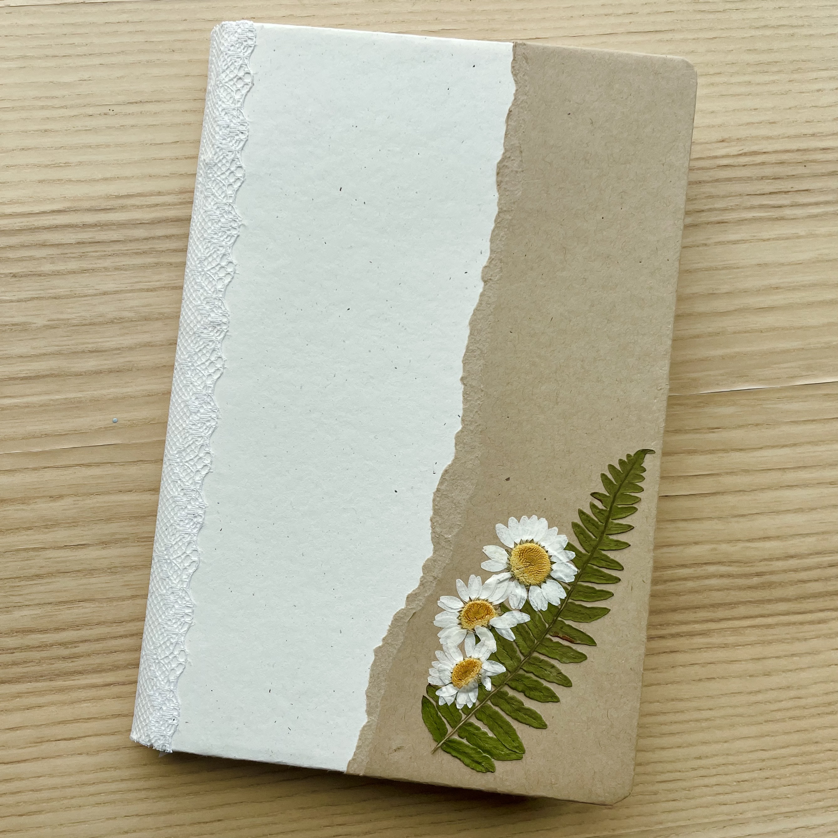 The journal covers are handcrafted with textured paper, showcasing my unique “ripped” design. I love decorating the covers with real pressed flowers for a touch of natural beauty or delicate lace on the spine for a little extra elegance. Each journal is hand-bound with care to lay flat when you work, and untrimmed to allow the natural deckled edges to show!